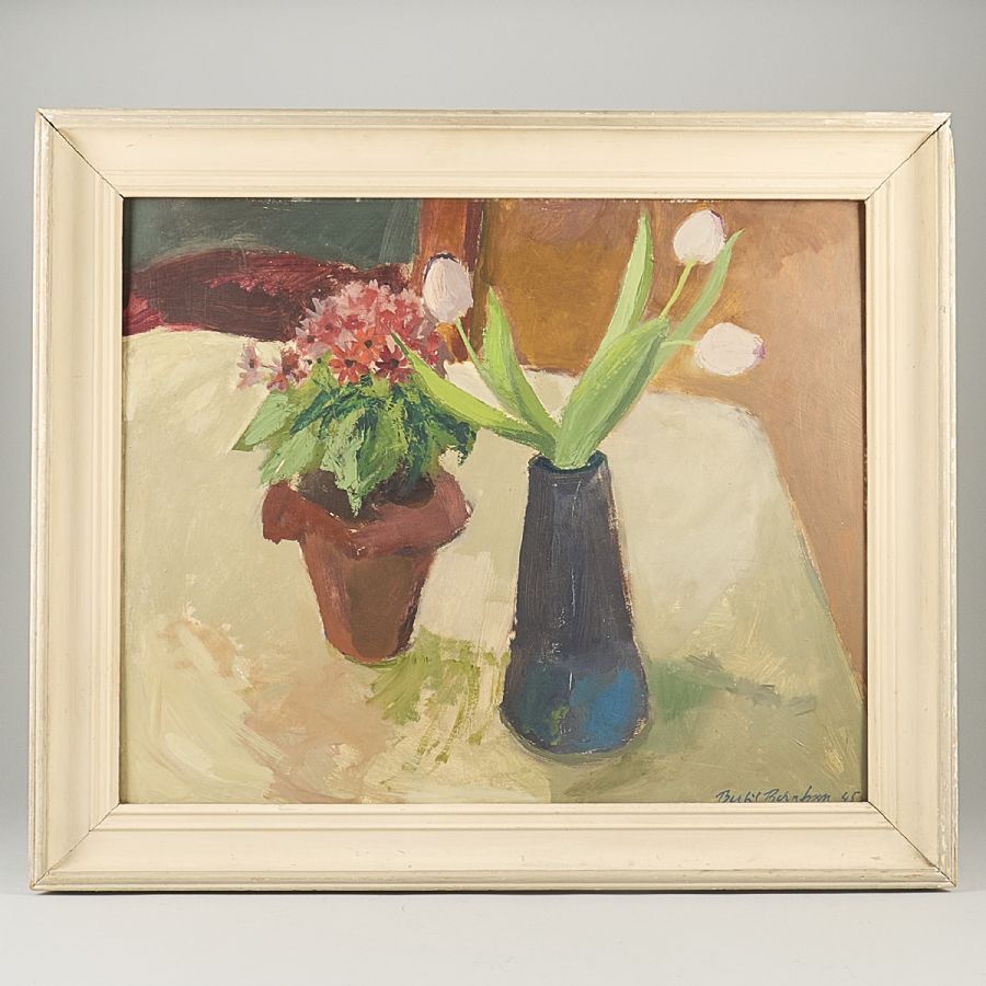 Bertil Berntsson, blomsterstilleben. Signerad, daterad -45. Olja på pannå, 56x69 cm, yttermått inklusive ram: 71x84 cm