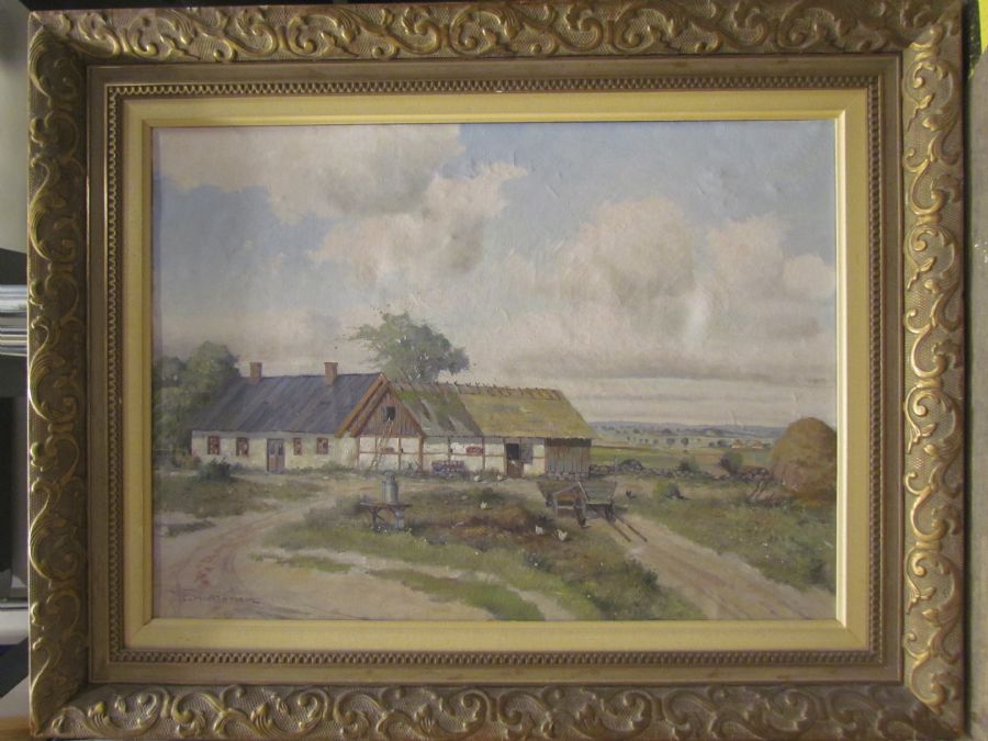 Oljemålning, Carl Månsson (1892-1976), skånegård, 50x66