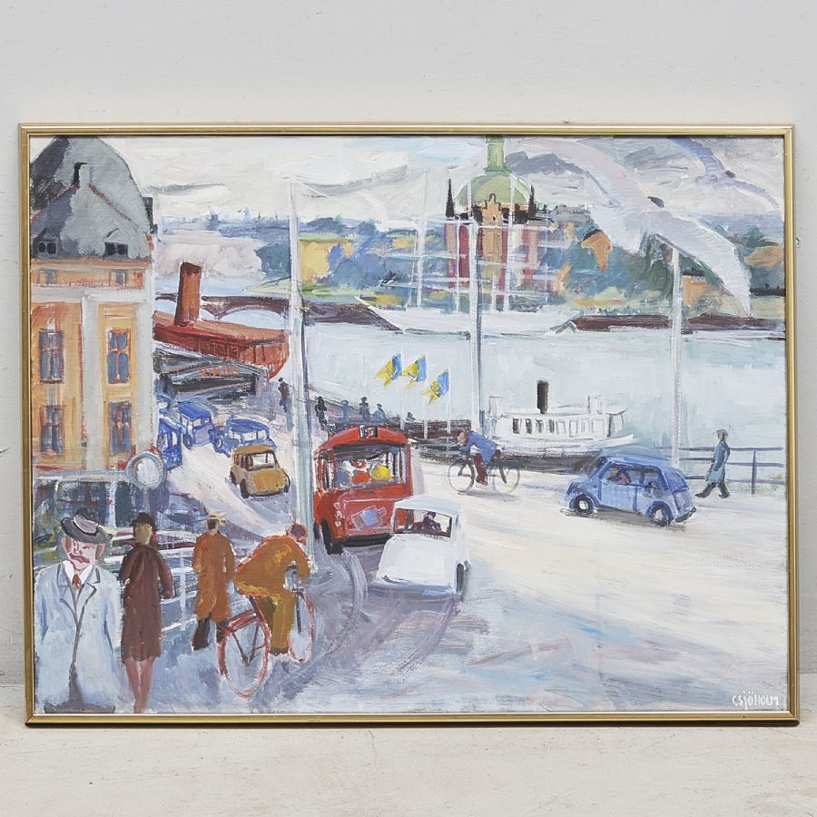 Charles Sjöholm (f. 1933), Sverige. Signerad, utsikt mot skeppsholmen. Olja på duk, 88x113 cm, yttermått inklusive ram: 92x119 cm