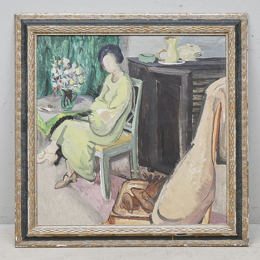 Oljemålning, "Interiör med Marga". Signerad, Osloutställningen 1948. Olja på duk, 73x73 cm, yttermått inklusive ram: 90x90