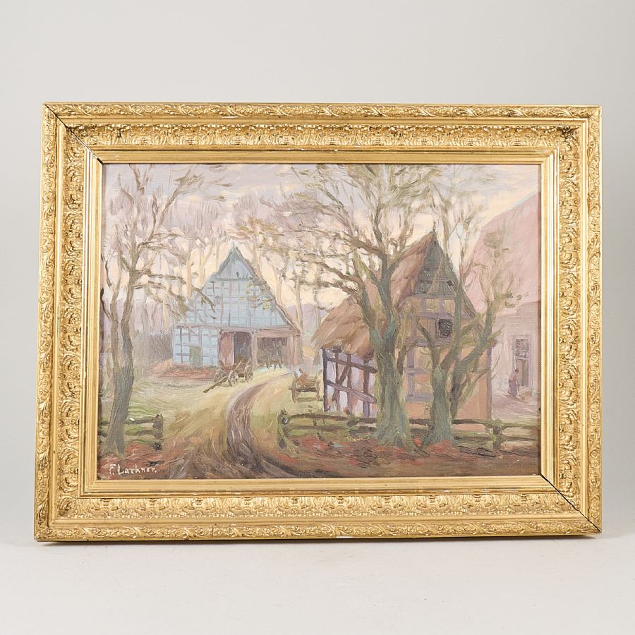F Lachner, Signerad, gård. Olja på duk, 38x52 cm, yttermått inklusive ram: 51x66
