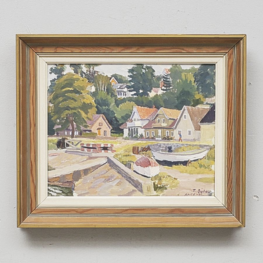Oljemålning, Signerad, daterad Arild 1949. Olja på pannå, 31x49 cm, yttermått inklusive ram: 45x53 cm