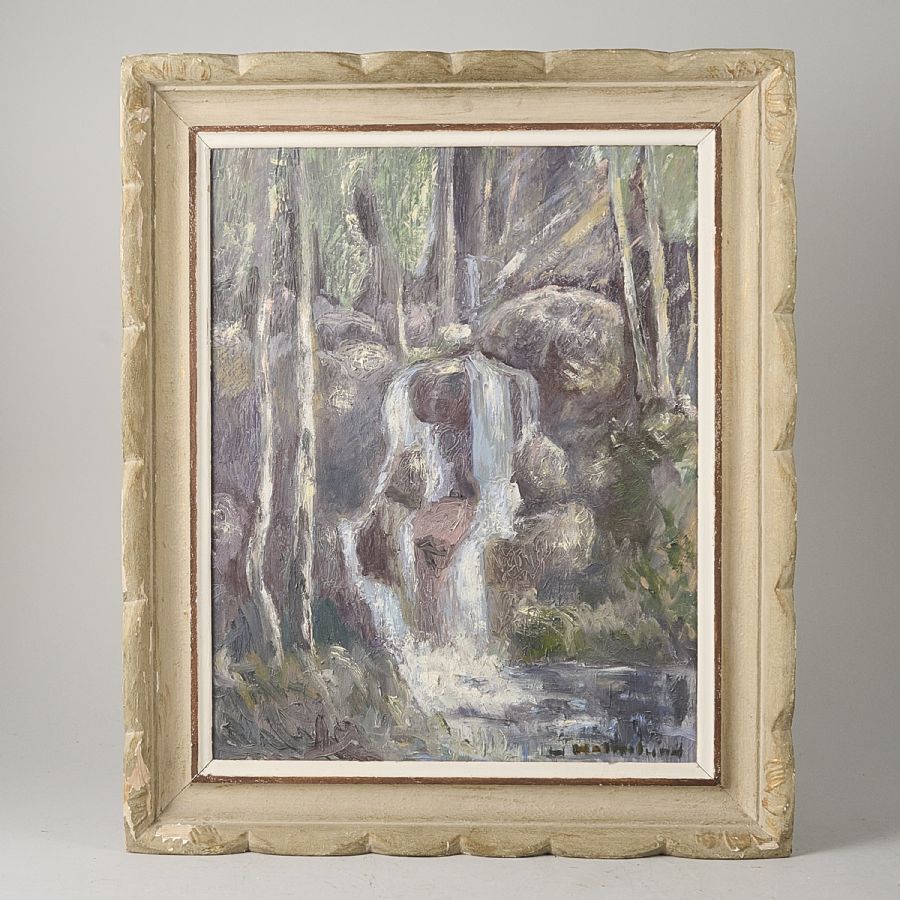 Helmer Holmlund. Signerad, skogsbäck. Olja på pannå, 53x41 cm, yttermått inklusive ram: 67x55 cm