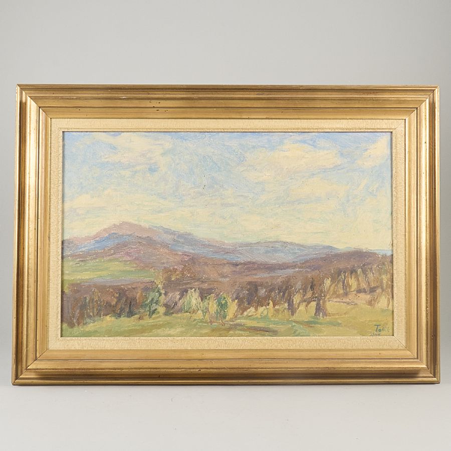 Oljemålning, Signerad. Daterad 1947, "Rödfjällen, Tänndalen". Olja på duk, 3759 cm, yttermått inklusive ram: 55x77 cm