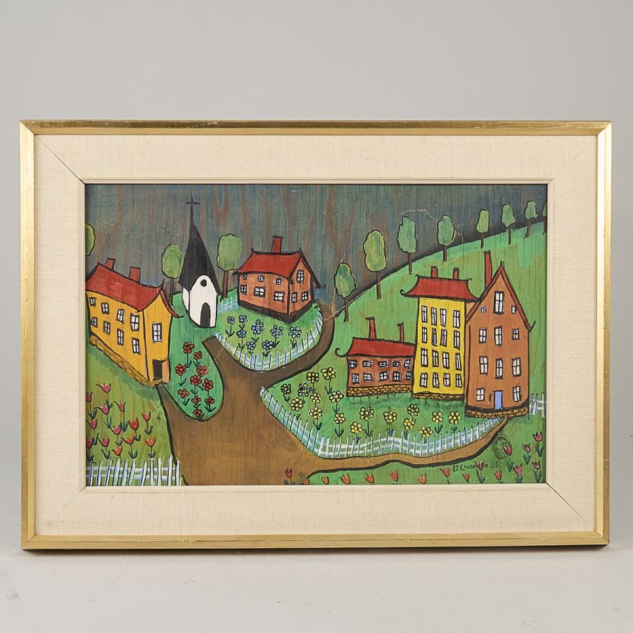 Inga Stina Landström. Signerad, daterad 55, bykyrka. Olja på pannå, 28x43 cm, yttermått inklusive ram: 40x55
