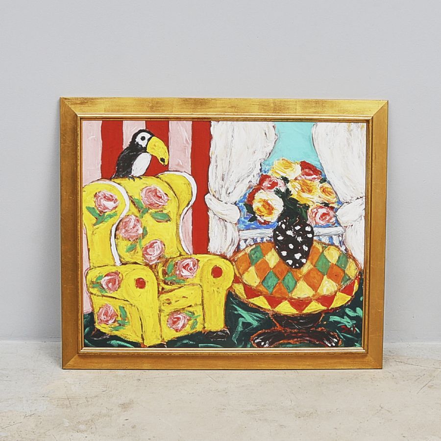Oljemålning, Signerad, Tukan i blommig fåtölj. Olja på duk, 80x100 cm, yttermått inklusive ram: 96x116 cm