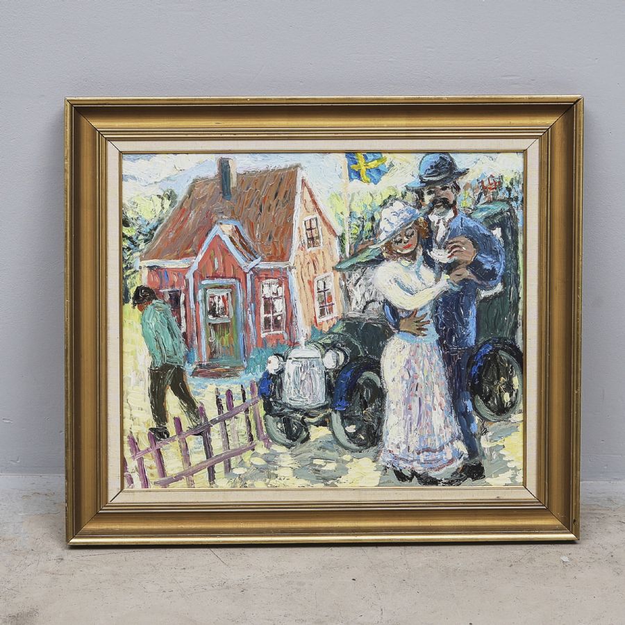 Lars Ljungquist, monogramsignerad, "Får jag låna den av dig". Olja på pannå, 55x66 cm, yttermått inklusive ram: 61x73 cm