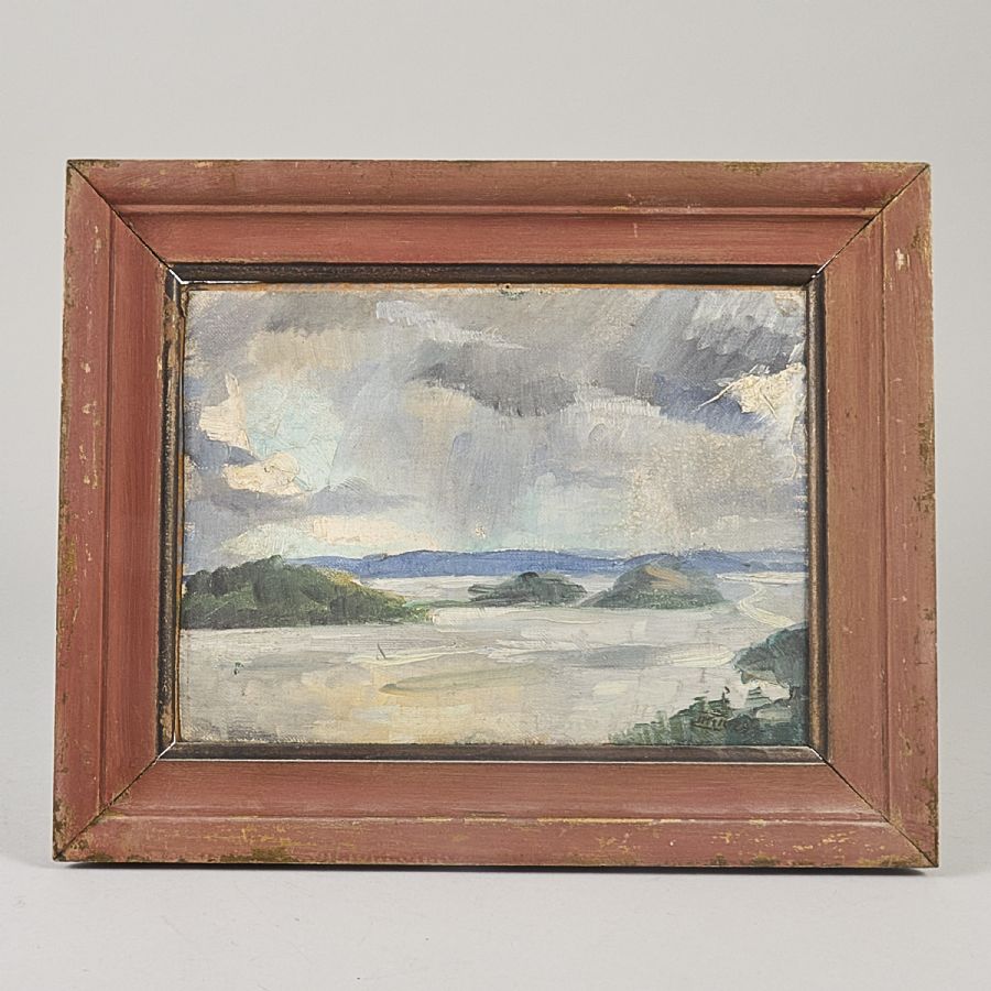 Oljemålning, Signerad, daterad 29, skärgård. Olja på pannå, 20x26 cm, yttermått inklusive ram: 28x35 cm