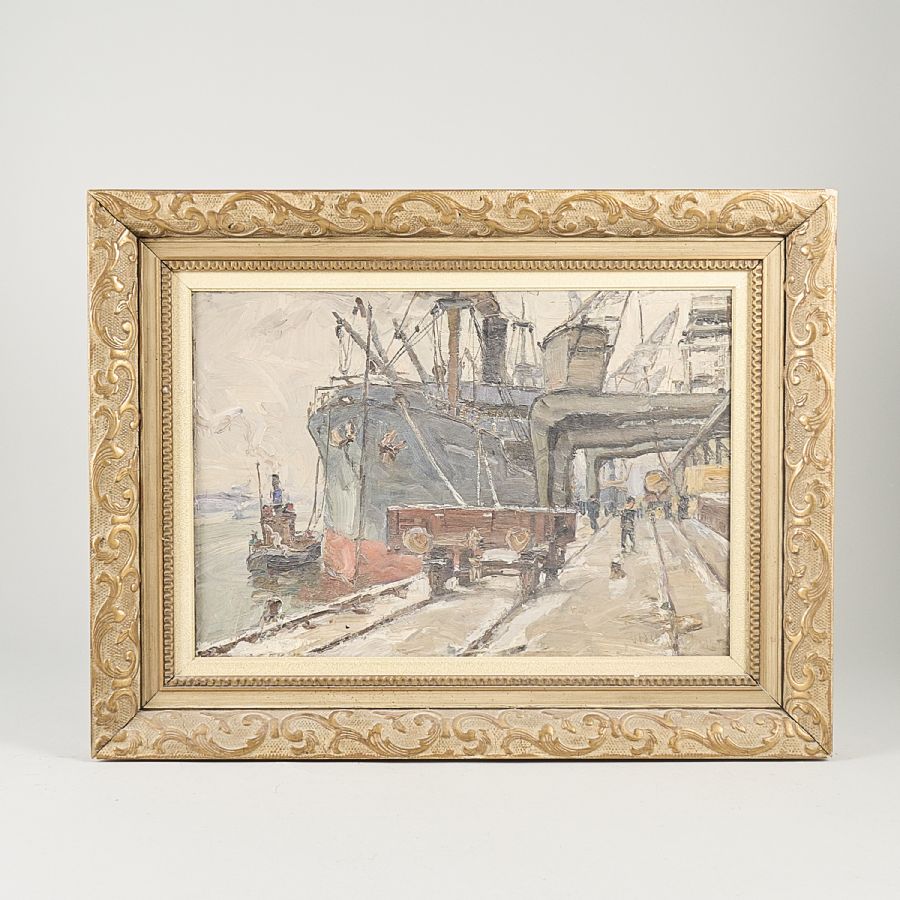 Oidentifierad konstnär. Otydlig signatur, daterad -42, Hamnmotiv. Olja på duk, 36x52 cm, yttermått inklusive ram: 54x69 cm