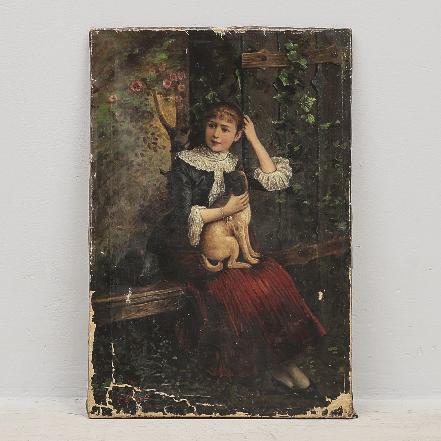 Oidentifierad konstnär. Signerad F. Grill, 1800-tal, flicka med hund, oramad. Olja på duk, 63x42