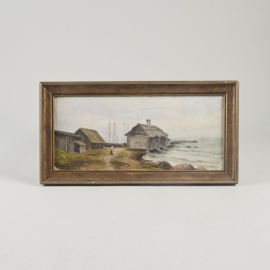 Oidentifierad konstnär. Signerad, fiskeläge. Olja på pannå, 13x29 cm, yttermått inklusive ram: 18x35 cm