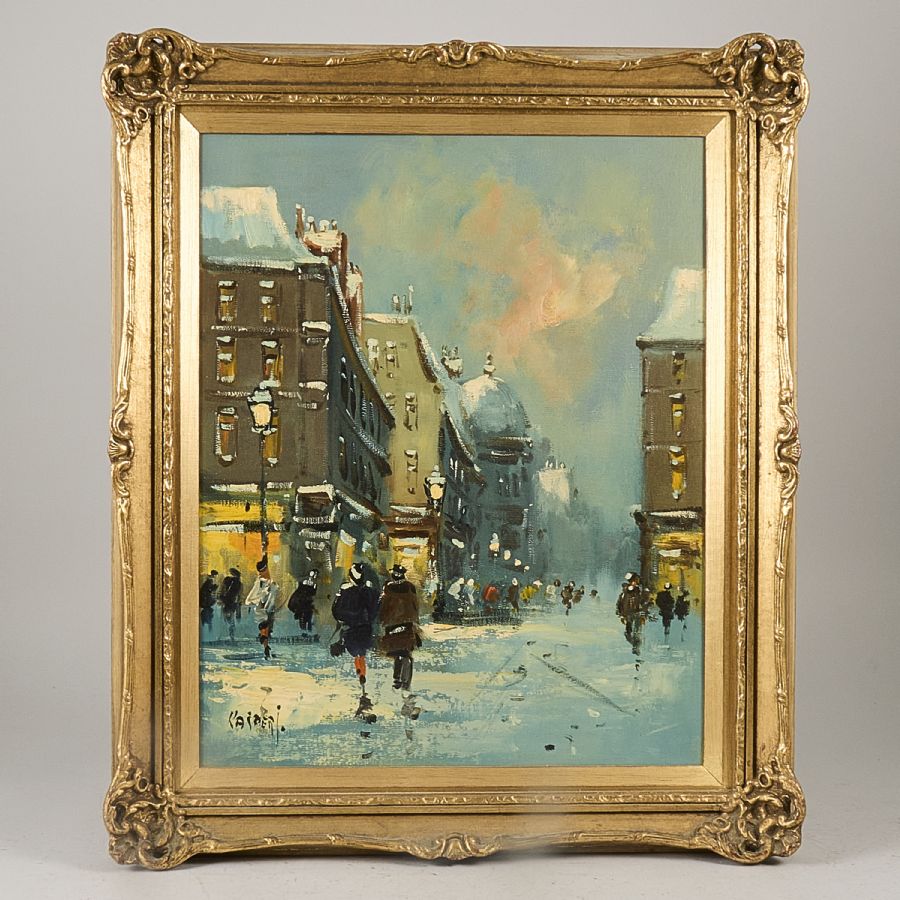unidentified artist. Signed. Gatuscen i vinter. Oil on canvas, 51x40 cm, outer dimensions including frame: 64x53 cm,