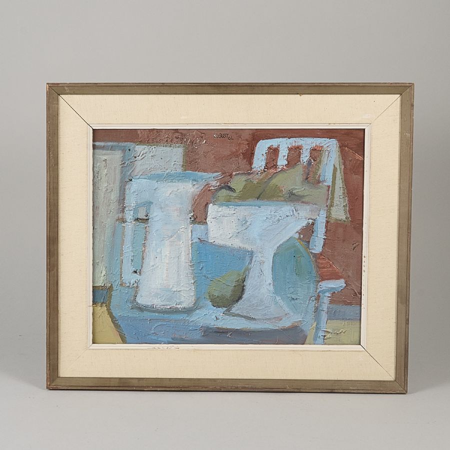 Oidentifierad konstnär. Signerad S. GUST, daterad -61, stilleben. Olja på pannå, 31x39 cm, yttermått inklusive ram: 44x52 cm