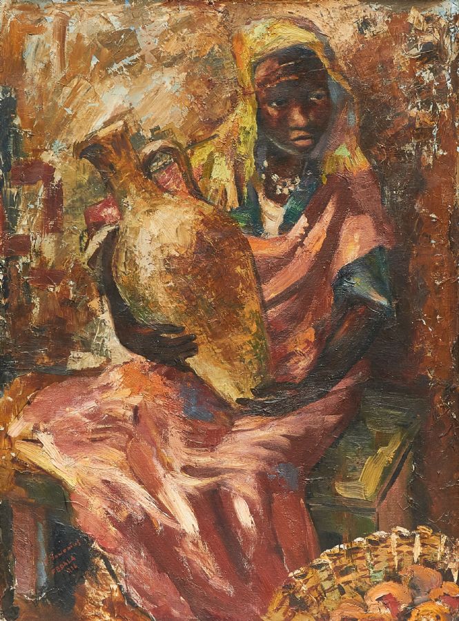 Oljemålning, Rudolf Gowenius (1896-1960), Kvinna med krus, med etikett på baksida: XV Salon de Tuileries, Paris, 61x46