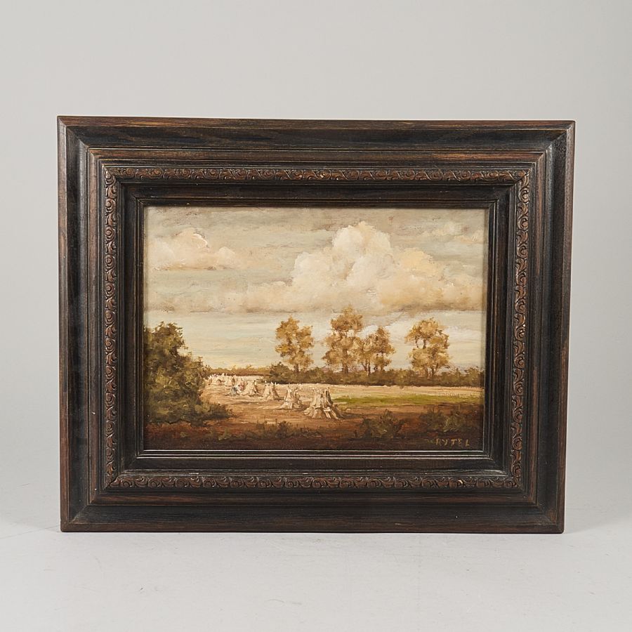 Rytel. Signerad, jordbruksarbete. Olja på duk. 26x32 cm, yttermått inklusive ram: 43x48 cm