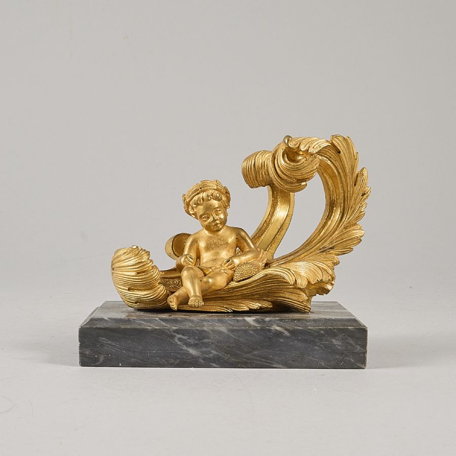 brons/sten, putto. Längd: 13 cm, höjd: 11 cm