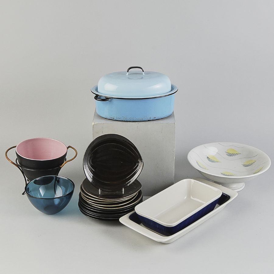 50-tals porslin + emaljgryta, bland annat Koka blå