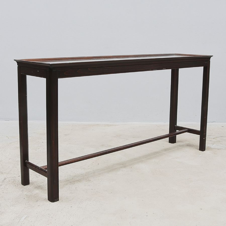 mahogny med glasskiva. Längd: 140 cm. Djup: 35 cm, höjd: 70 cm
