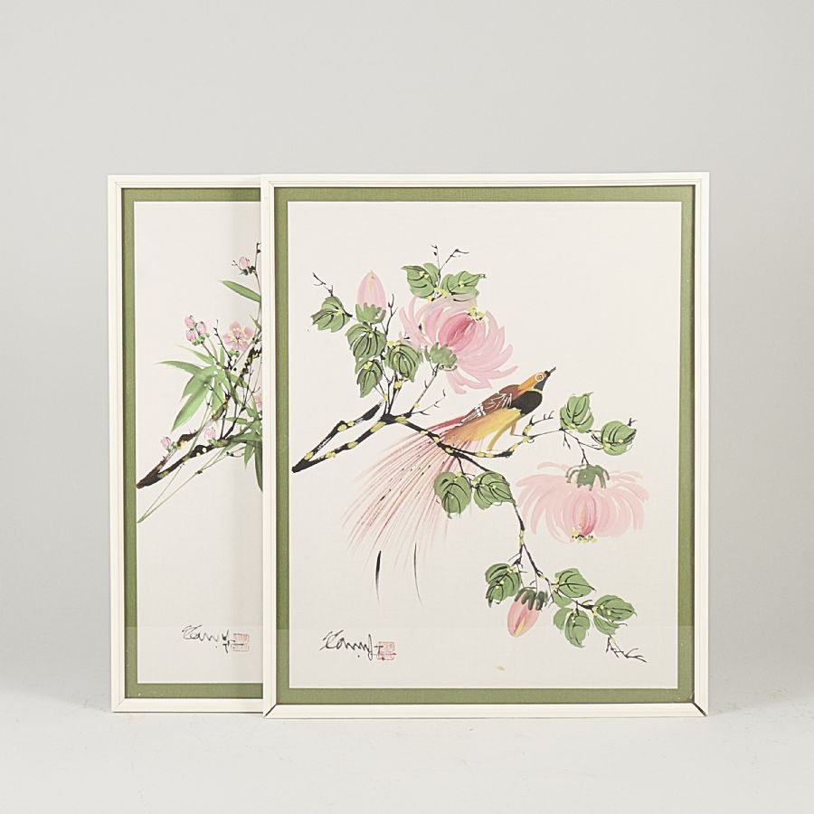 2 st, Kina, Fåglar, yttermått inklusive ram: 50x40 cm
