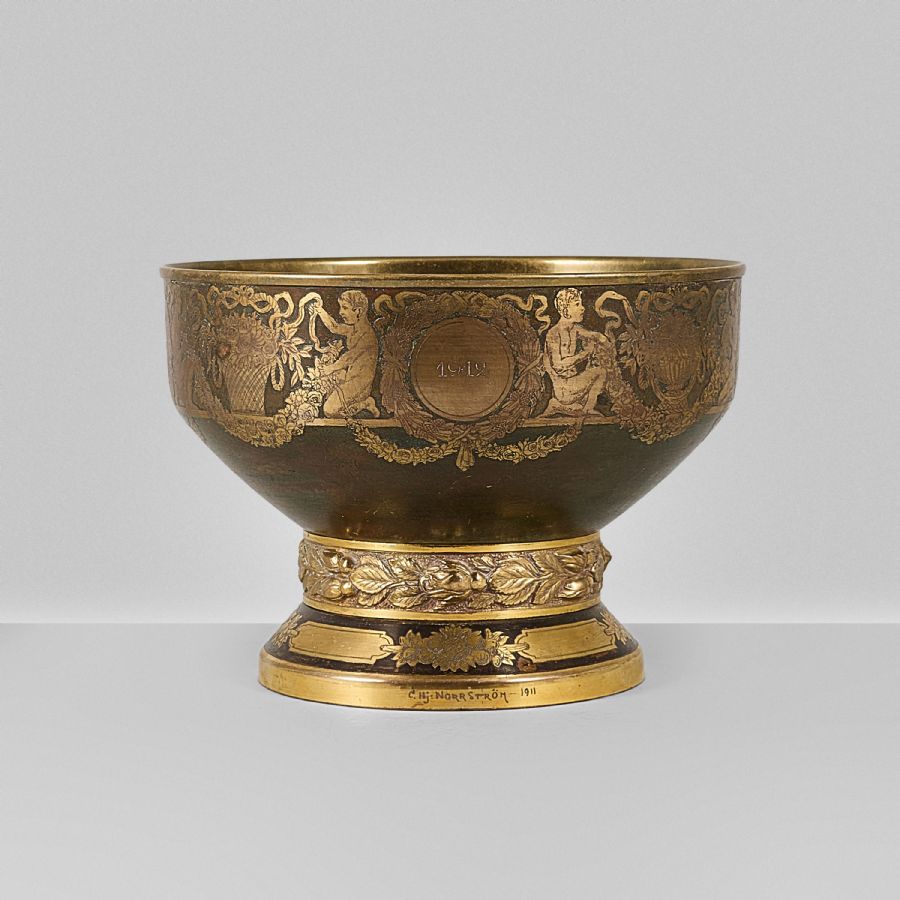 Skål, Delvis patinerad och förgylld koppar och mässing. Etsad, förgylld delvis graverad dekor av blomster och blad med mera. Signerad C Hj NORRSTRÖM 1911. Inskription "Till Jac Svensson / Å vänner i Storängen / 11 aug / 1912". Diameter: 21,5 cm. Höjd: 16 cm. En alternativ sockel medföljer. Hjalmar Norrström bodde på Ängsvägen 21 i Storängen. Konsul Jac Svensson bodde på Storängsvägen 19 i Storängen från 1904-1945 och var en central person i Storängens sociala liv