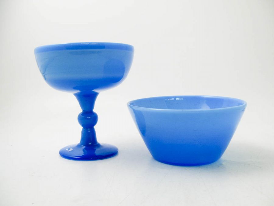 2 st, skål + skål på fot, Erik Höglund (1932-1998) för Boda Glasbruk, turkosblått glas, 9 cm (dia. 18 cm) + 17 cm, 1 osign, H 1669/170