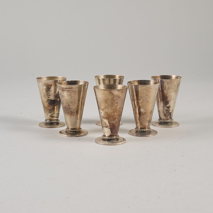 6 st, silver, K&Ec, Tore Eldh, Göteborg, 1951. Höjd: 6 cm, vikt: 170g ca