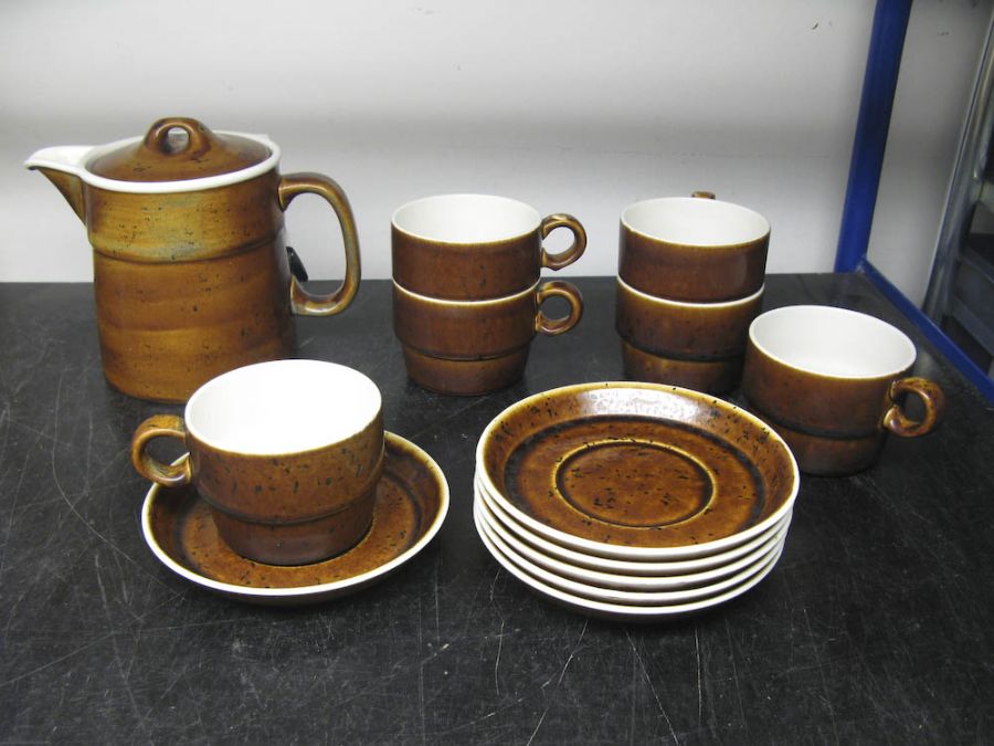 Tegods, 7 del, Stig Lindberg (1916-1982), Coq, Gustavsberg 1966-1985, ugnssäker, brun med vita kanter