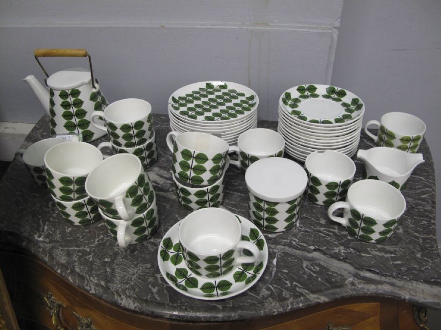 Teservis, 29 del,Stig Lindberg (1916-1982), Berså, Gustavsberg 1960-1974, stiliserade gröna blad på vit botten