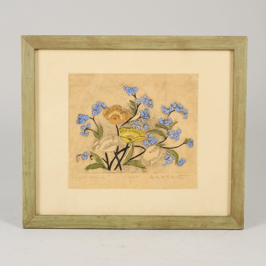 Träsnitt, "Förget-mig-ej". Signerad, bladets mått: 19x21 cm, yttermått inklusive ram: 33x37 cm