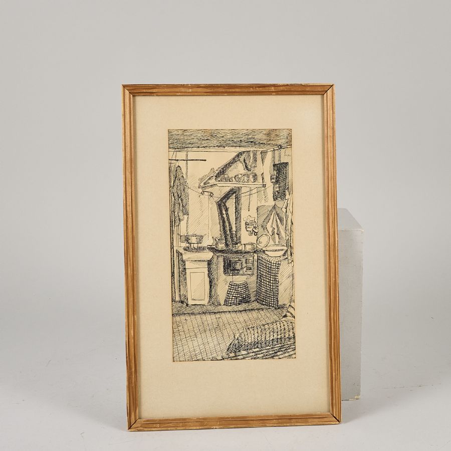 Oidentifierad konstnär. Köksinteriör. Bildmått: 25x13 cm, yttermått inklusive ram: 38x24 cm