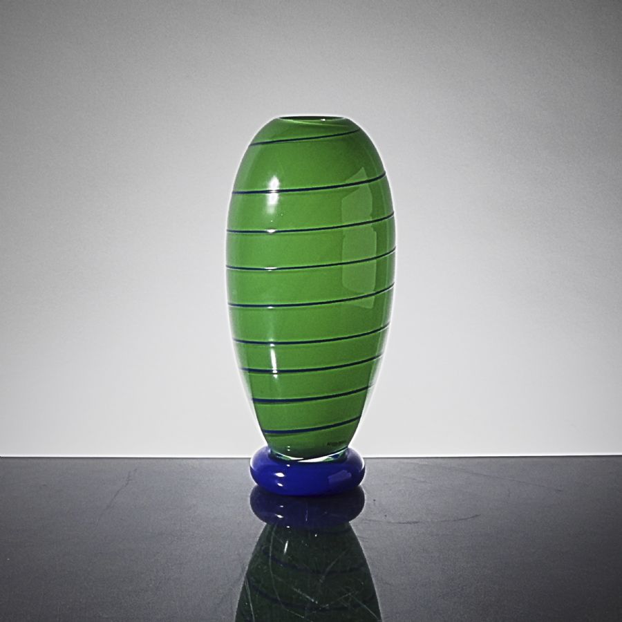Vas, Kosta Boda, grönt glas med blå rand. Signerad. Höjd: 29 cm