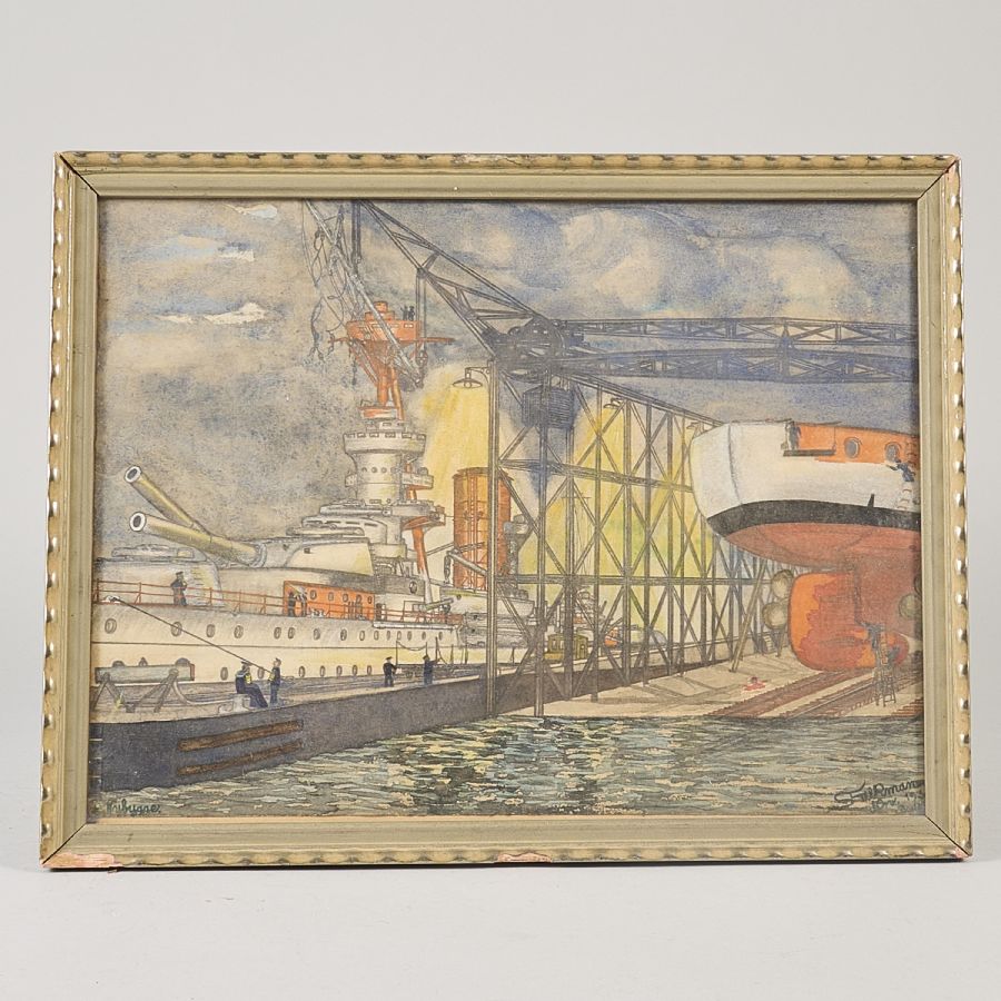 Stephan Falkman. Signerad, daterad Berlin 1930, Slagskeppet Kronan, 24x31 cm, yttermått inklusive ram: 27x34 cm