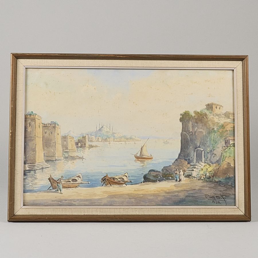 unidentified artist. Signed, dated -32, motiv från Turkiet. Watercolour, Image dimensions: 26x39 cm, outer dimensions including frame: 31x45 cm,