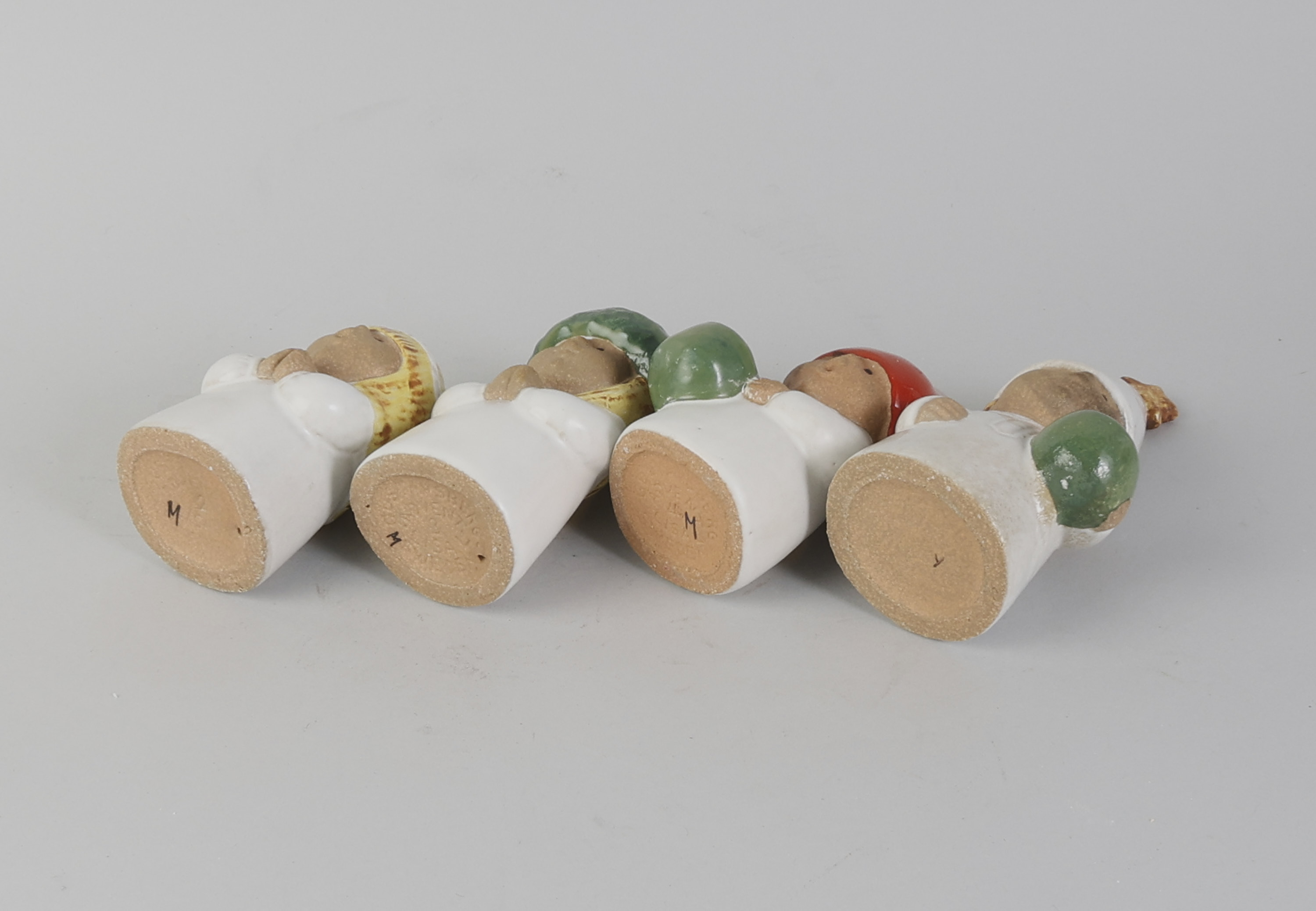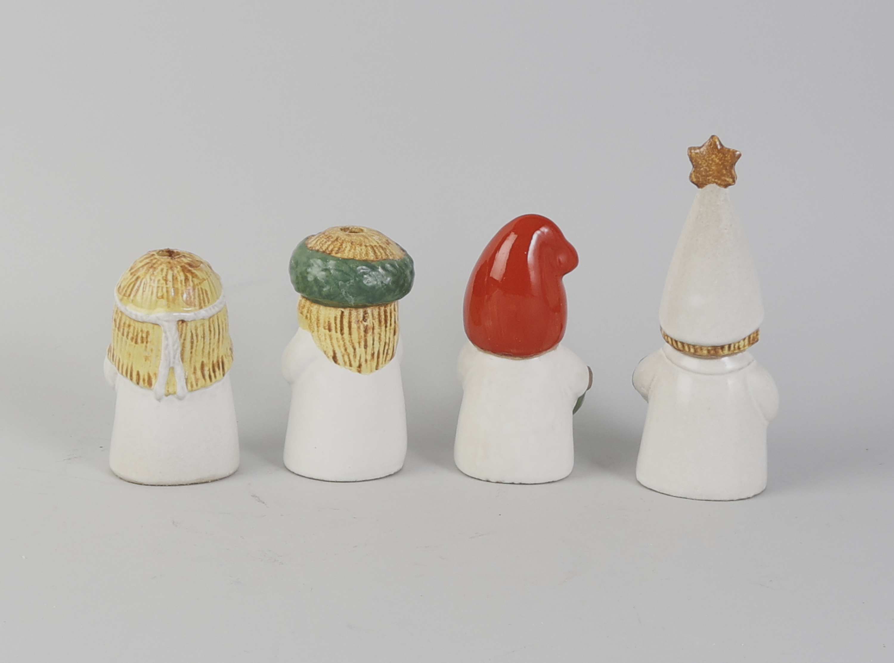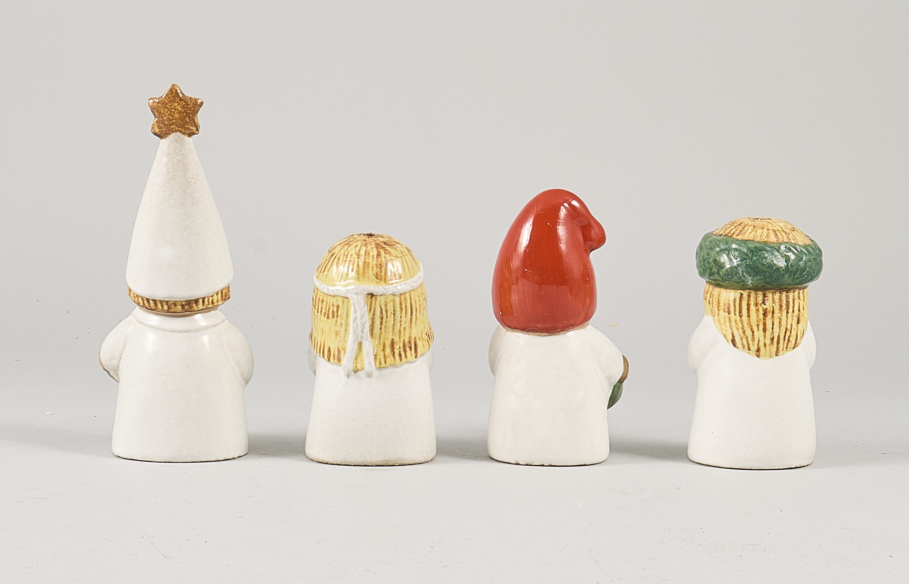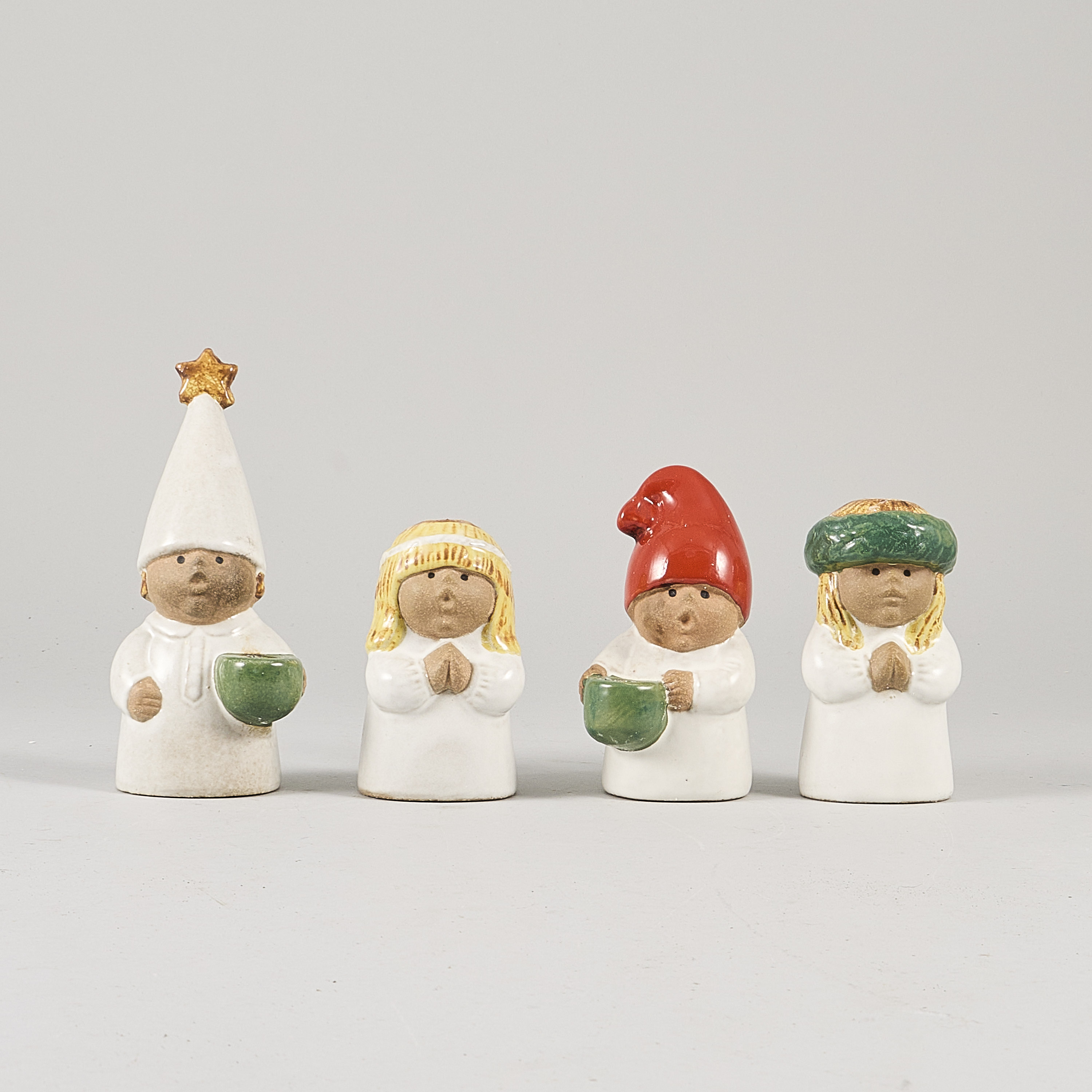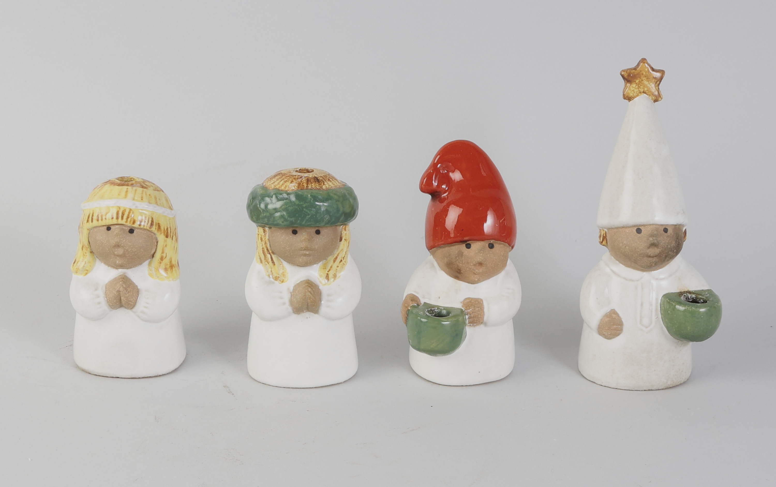 4 delar, Lisa Larson (1931-2024), Sverige. Luciatåg ur Advent, Gustavsberg, Lucia, Tärna, Stjärngosse och Tomte. Stengods. Höjd: 10-17 cm, sot