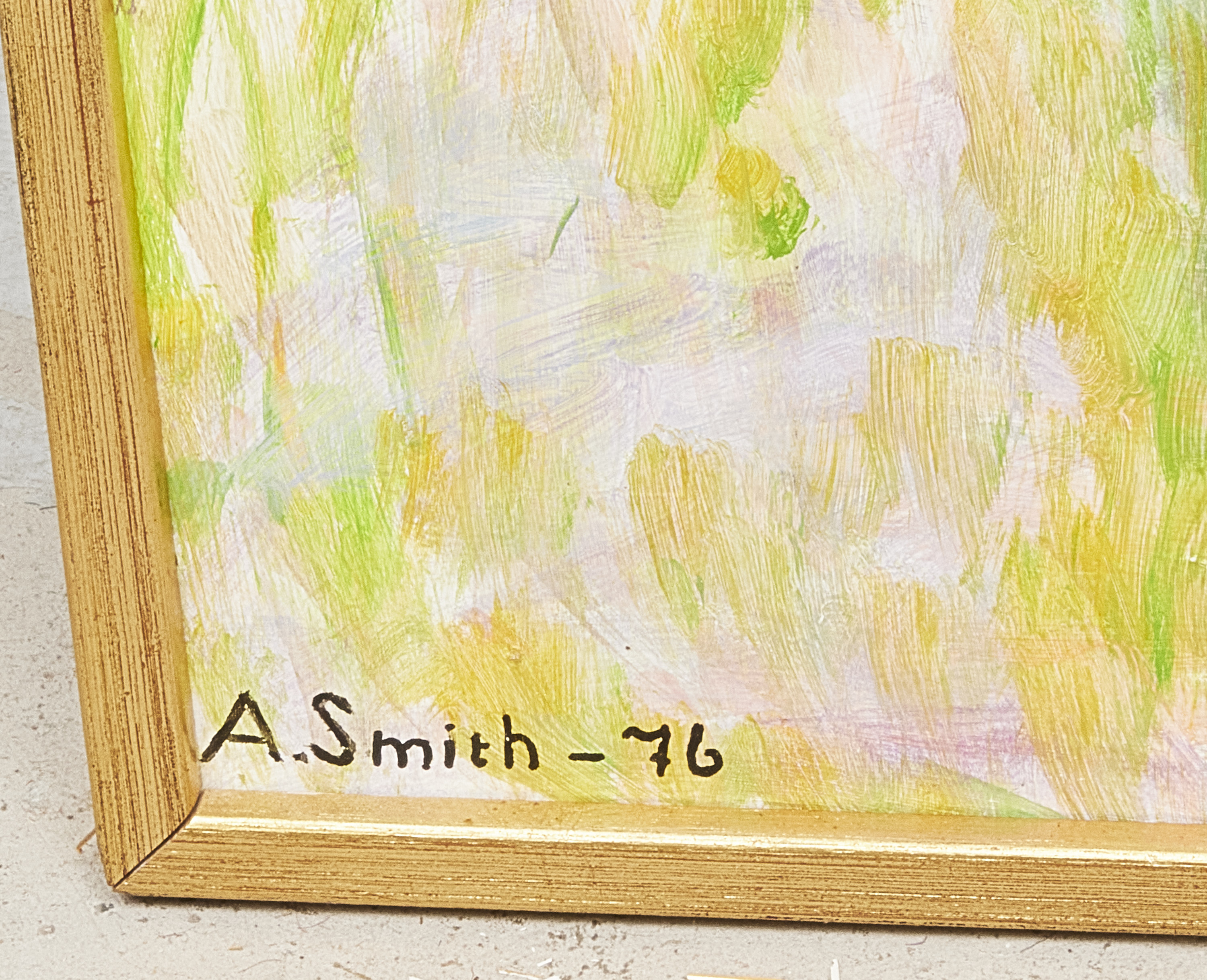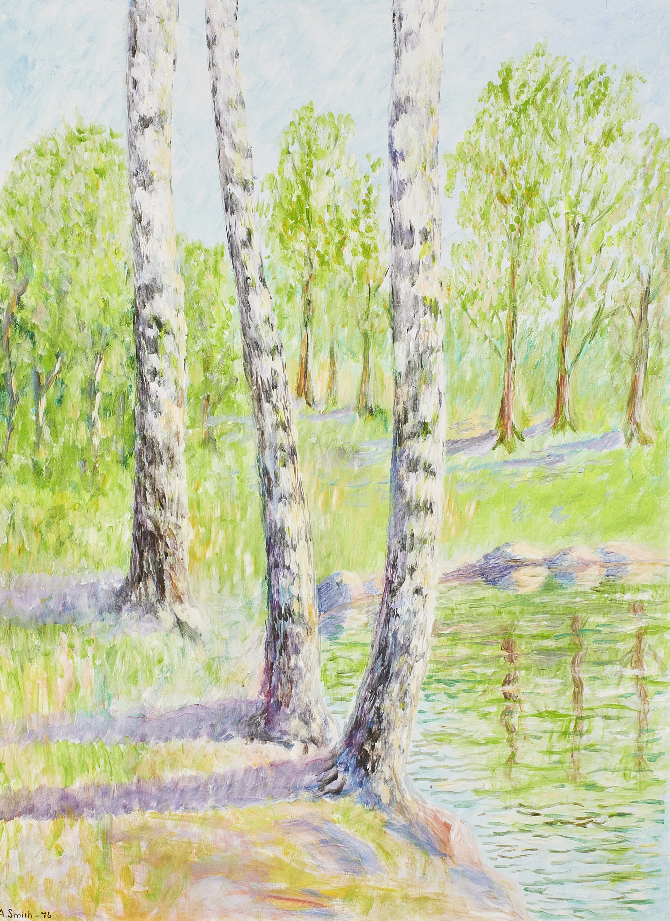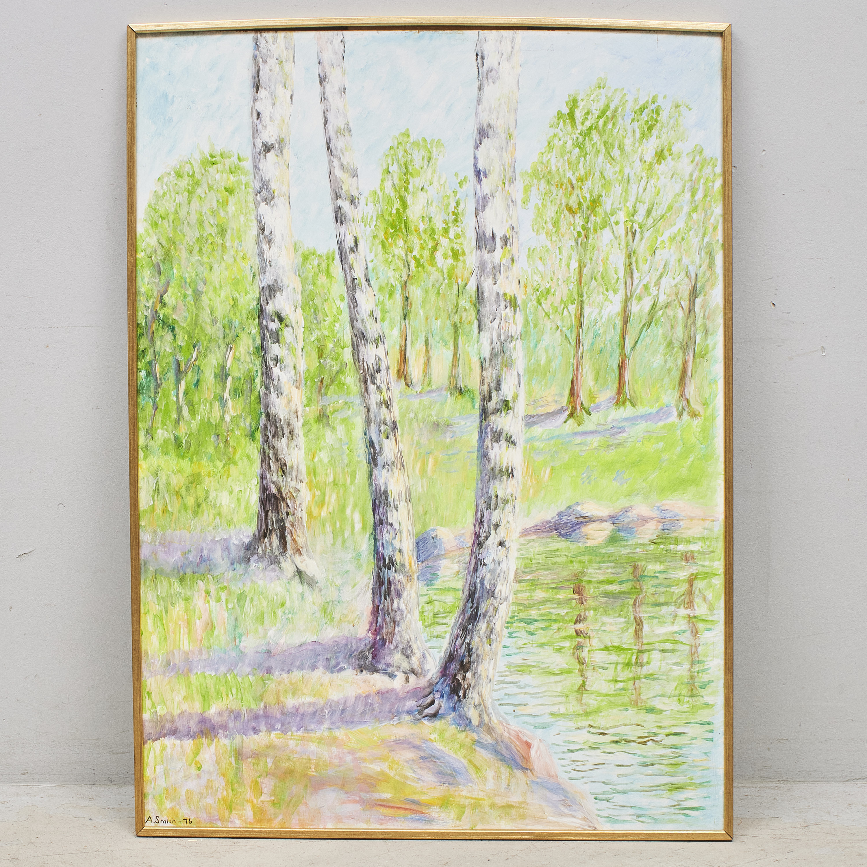 A Smith. Signerad, daterad - 76, björkar. Olja på pannå. Yttermått inklusive ram: 91x123 cm