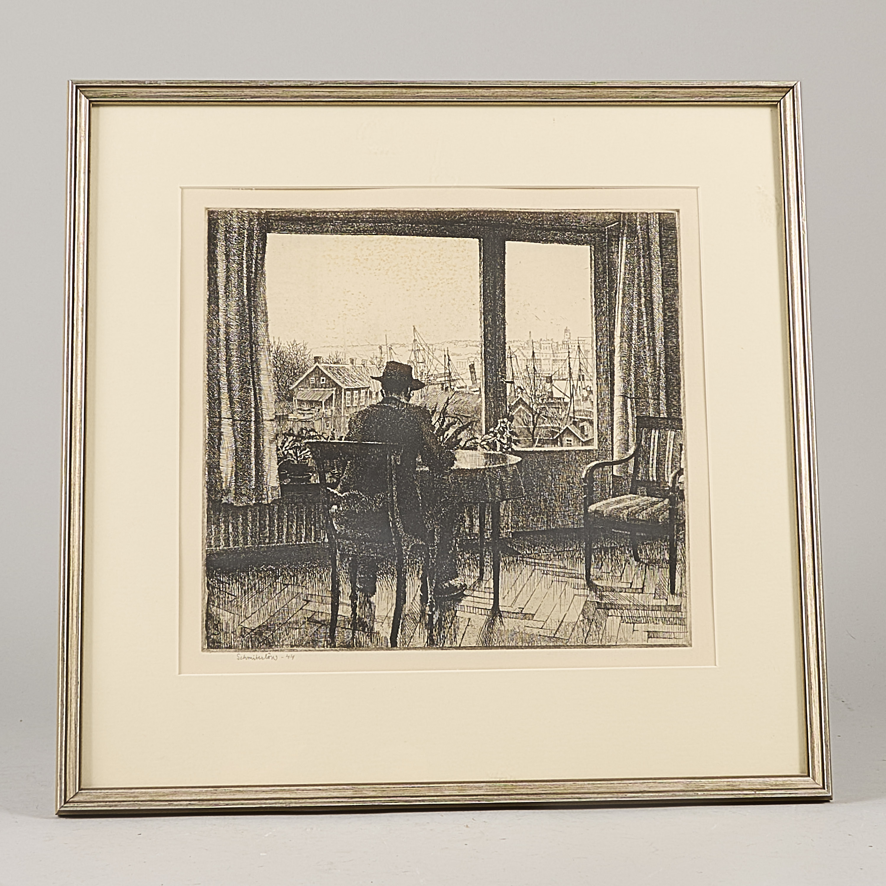 Bertram Schmiterlöw (1920-2002), Sverige. Man vid fönster. Signerad, daterad -44. Bildmått: 23x25 cm, yttermått inklusive ram: 38x39 cm