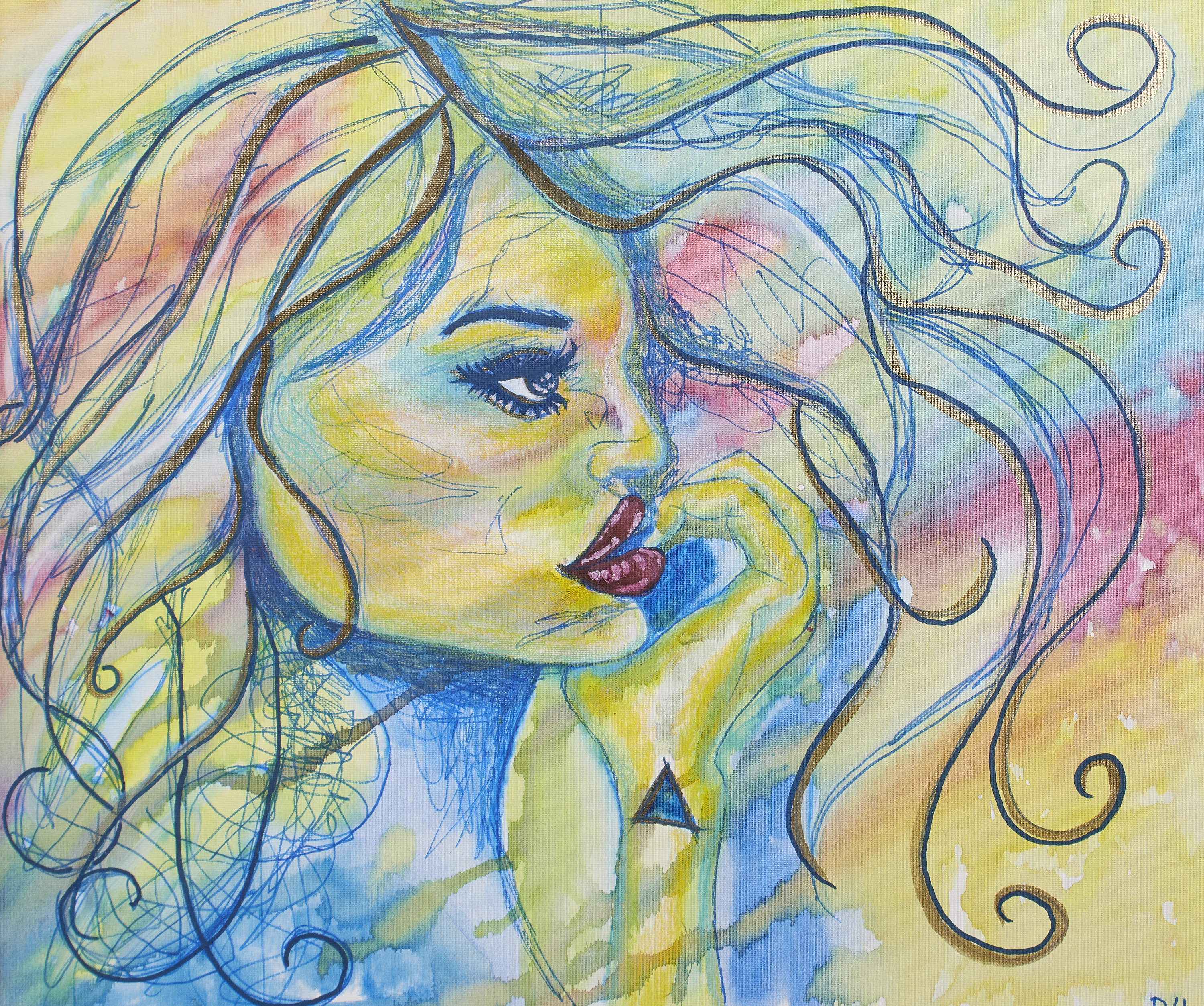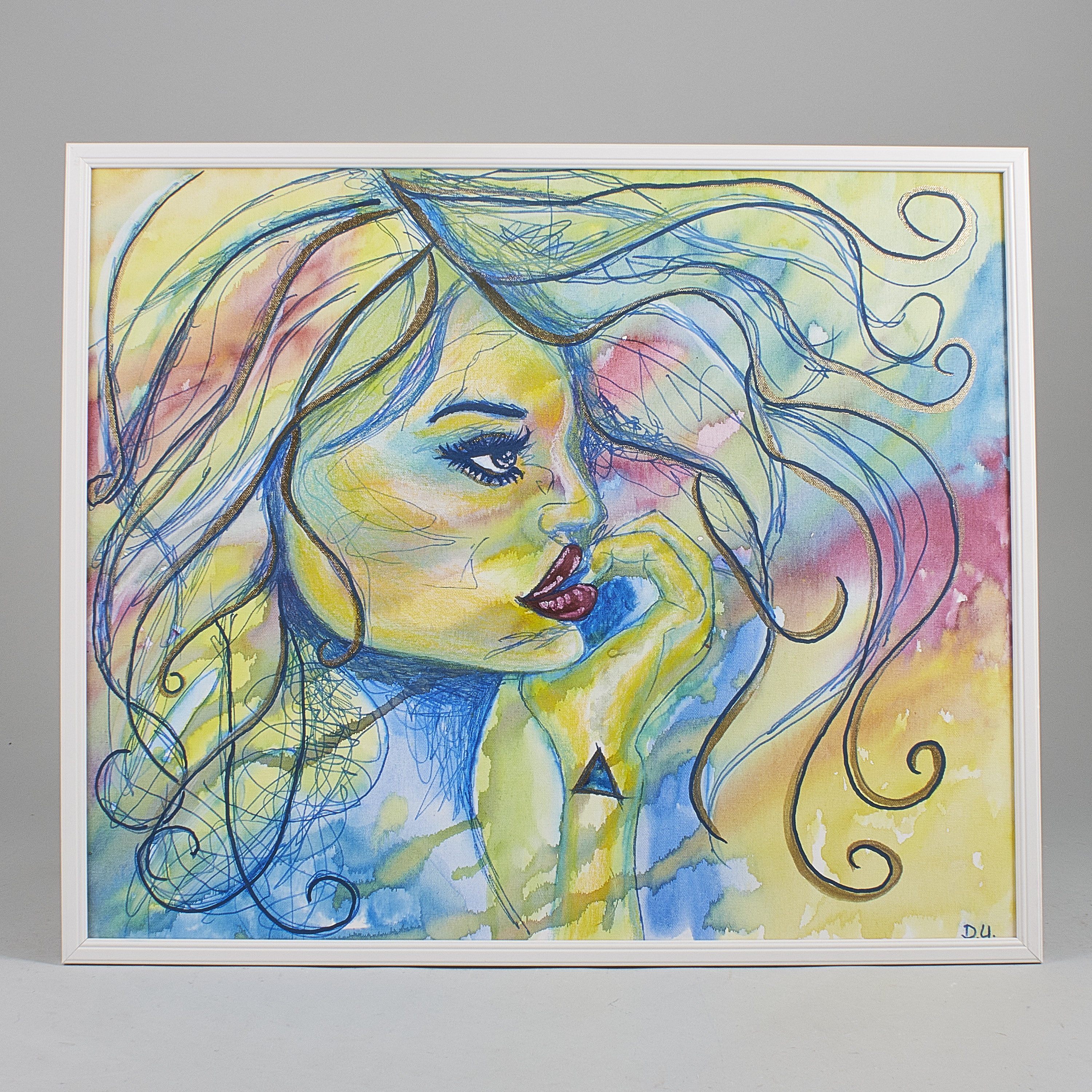 Dominyka Usvaiskaya. Kvinna. Monomgramsignerad. Mixed media akryl på pannå, 45x54 cm