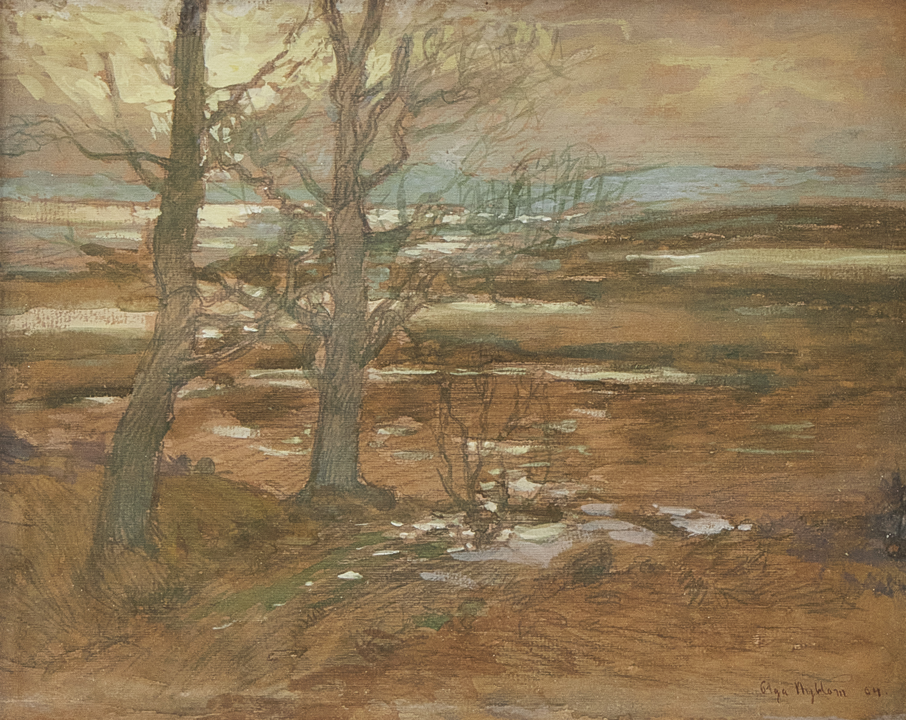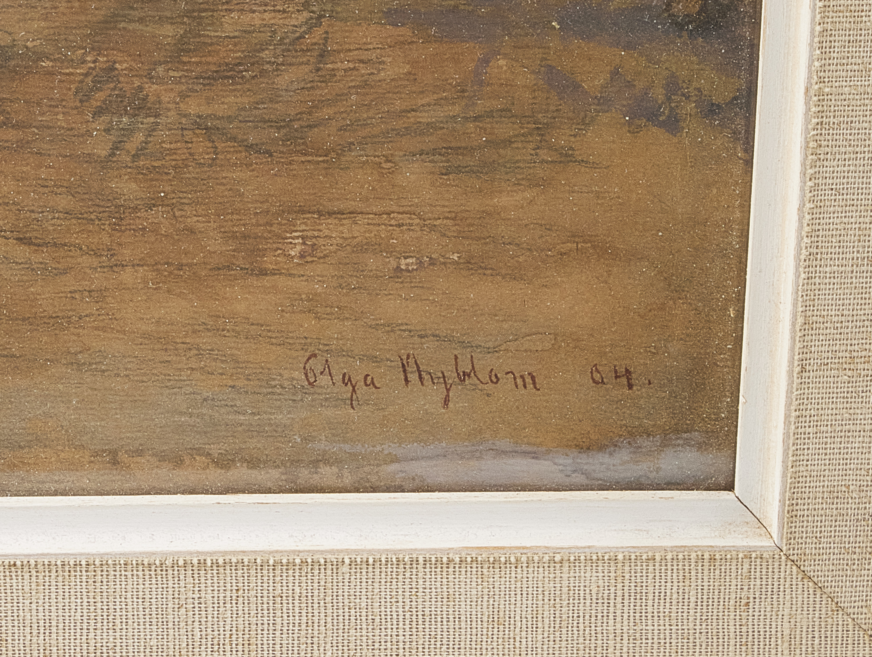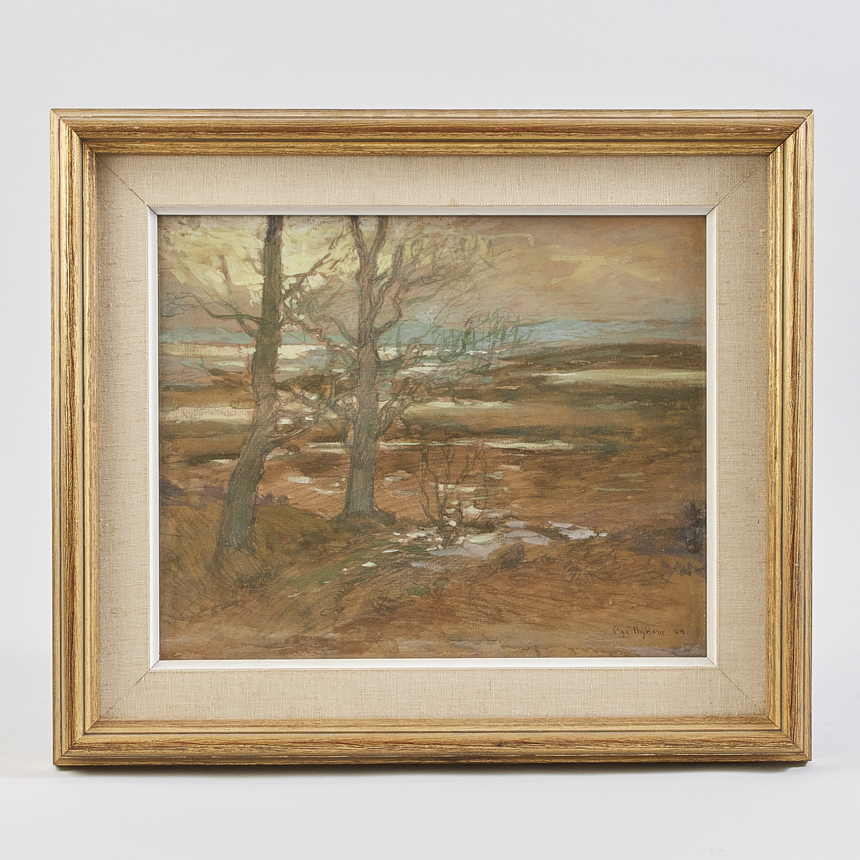 Olga Nyblom (1872-1955), Sverige. Landskap. Signerad. Blandteknik, daterad 1904. Bildmått: 31x38 cm, yttermått inklusive ram: 45x53 cm. Olga Nyblom bodde på Ängsvägen 24 i Storängen