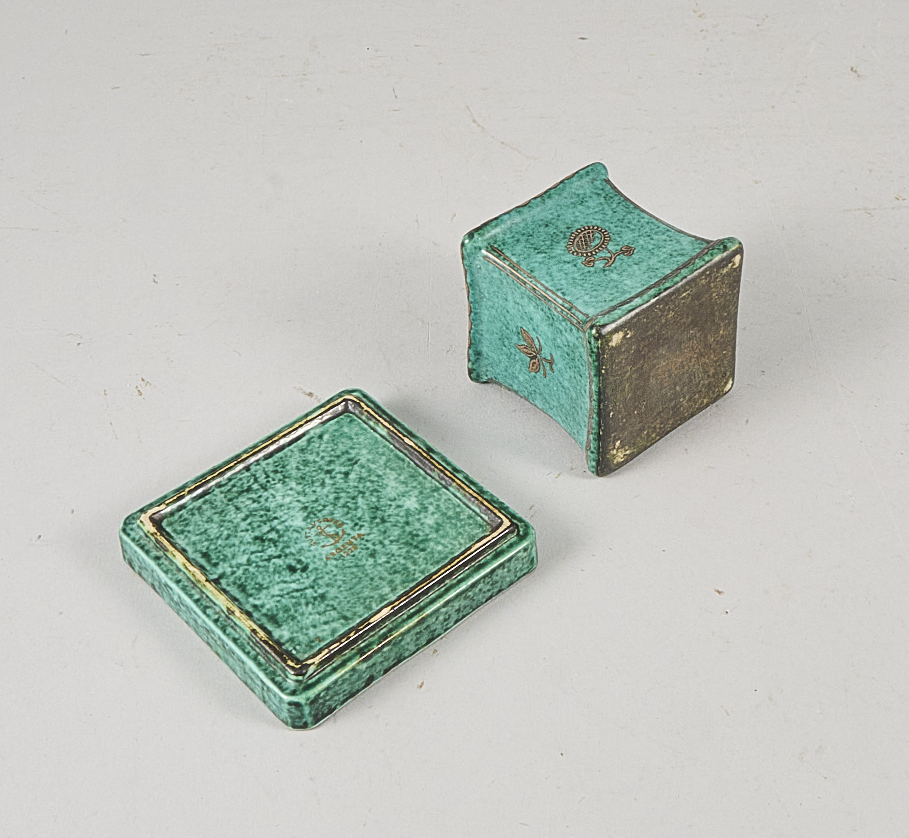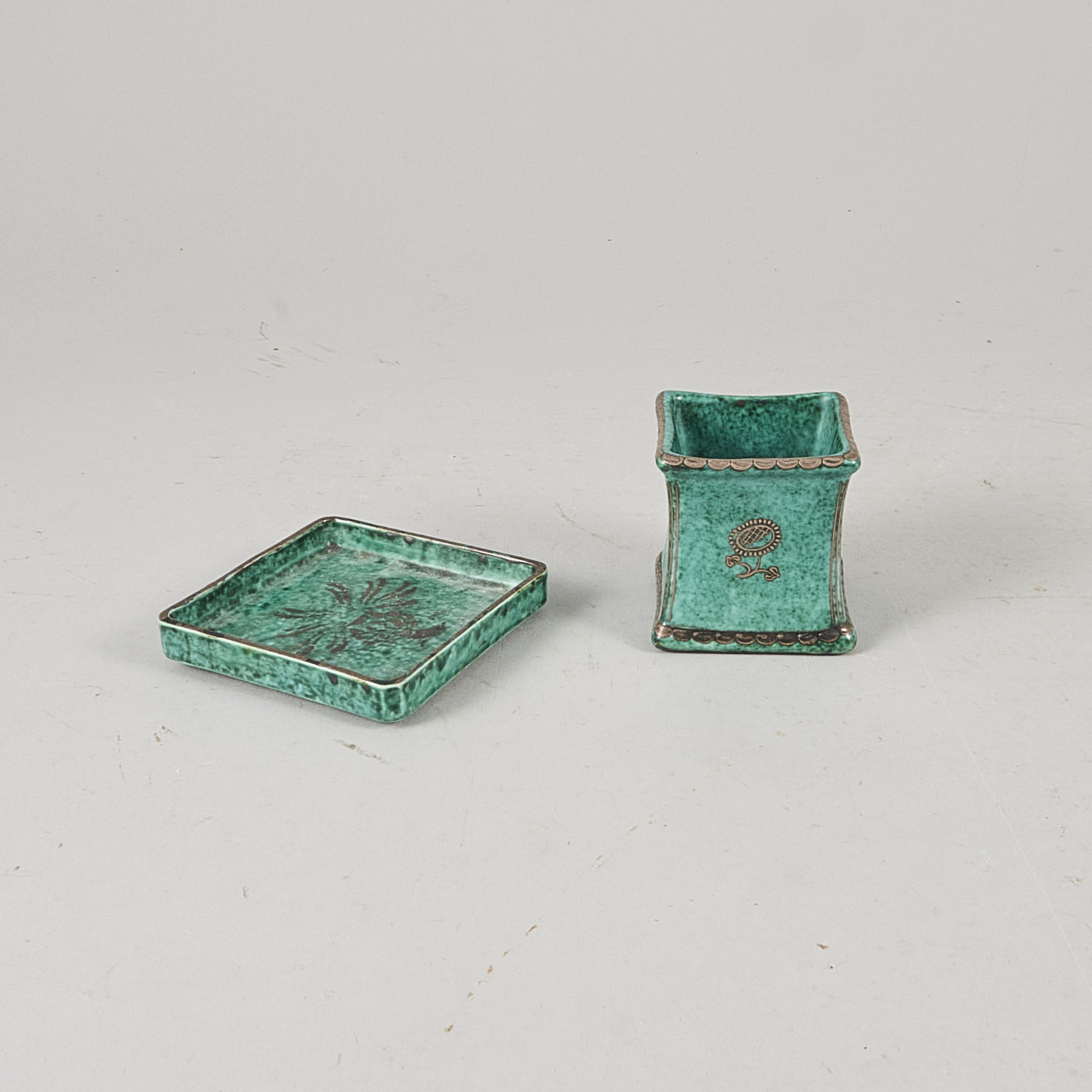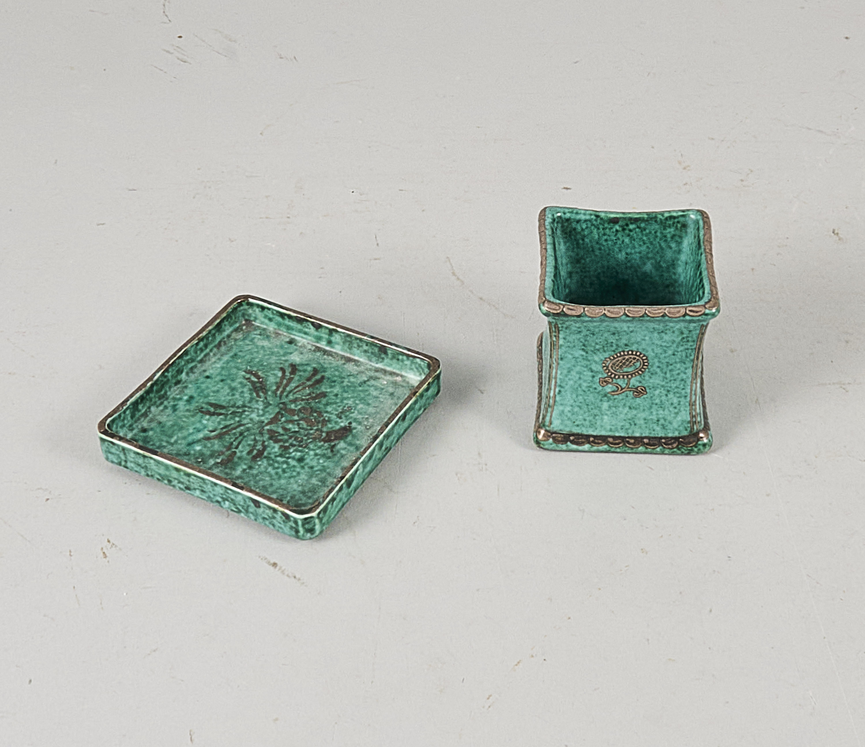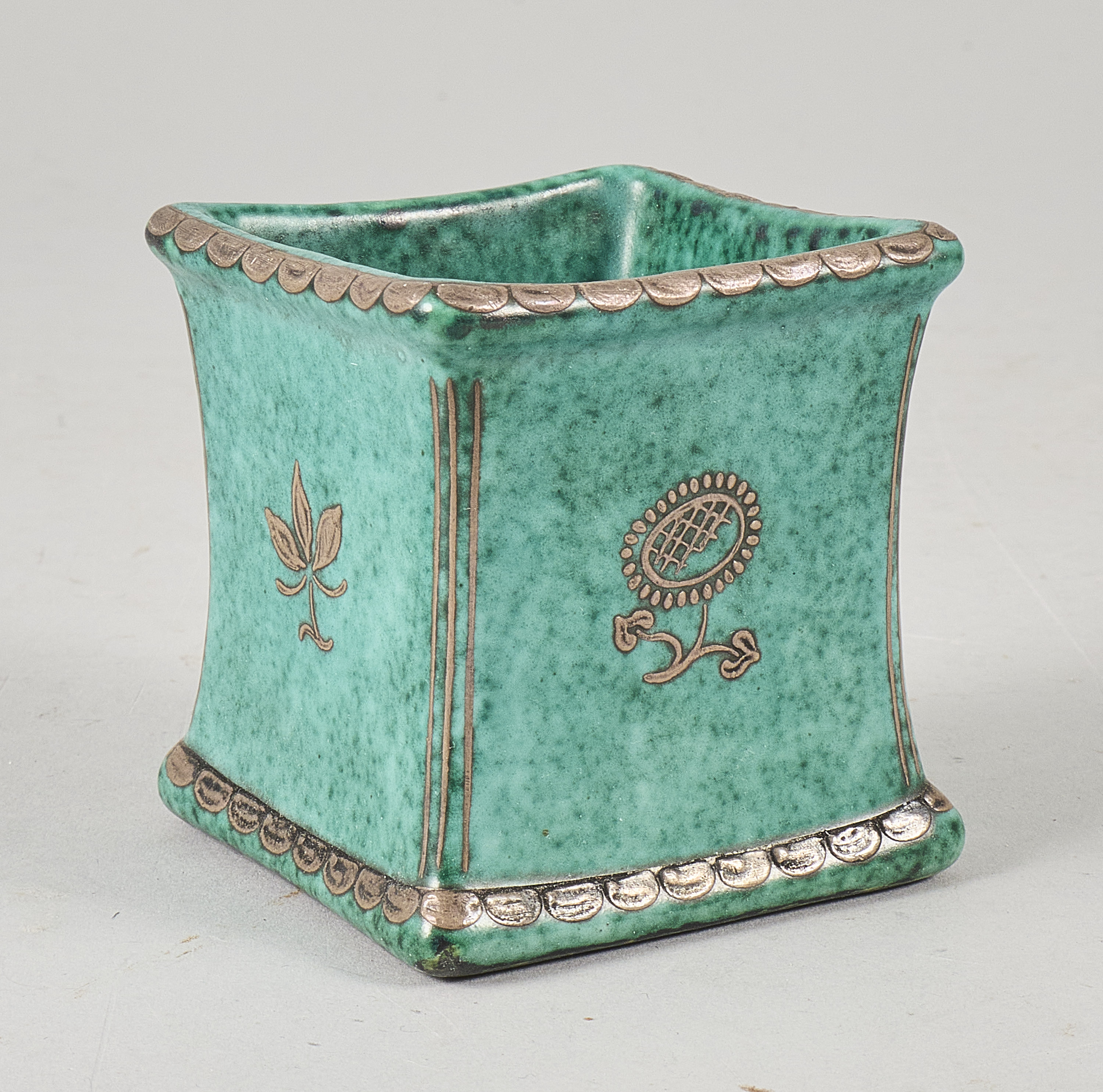 + vas, Wilhelm Kåge (1889-1960), Sverige. Argenta, Gustavsberg. Stengods, grön glasyr med målad silverdekor, 9X9. Höjd: 6,5 cm