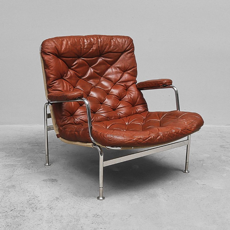 Fåtölj, Karin, Dux. Stomme av kromad metall, dynor i läder. Ej på hjul