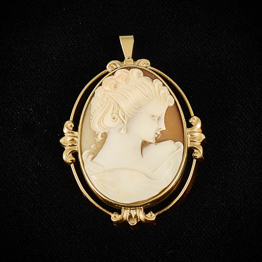 /hänge, 18k guld med camé. Höjd: 5 cm, vikt: 10,1 g.