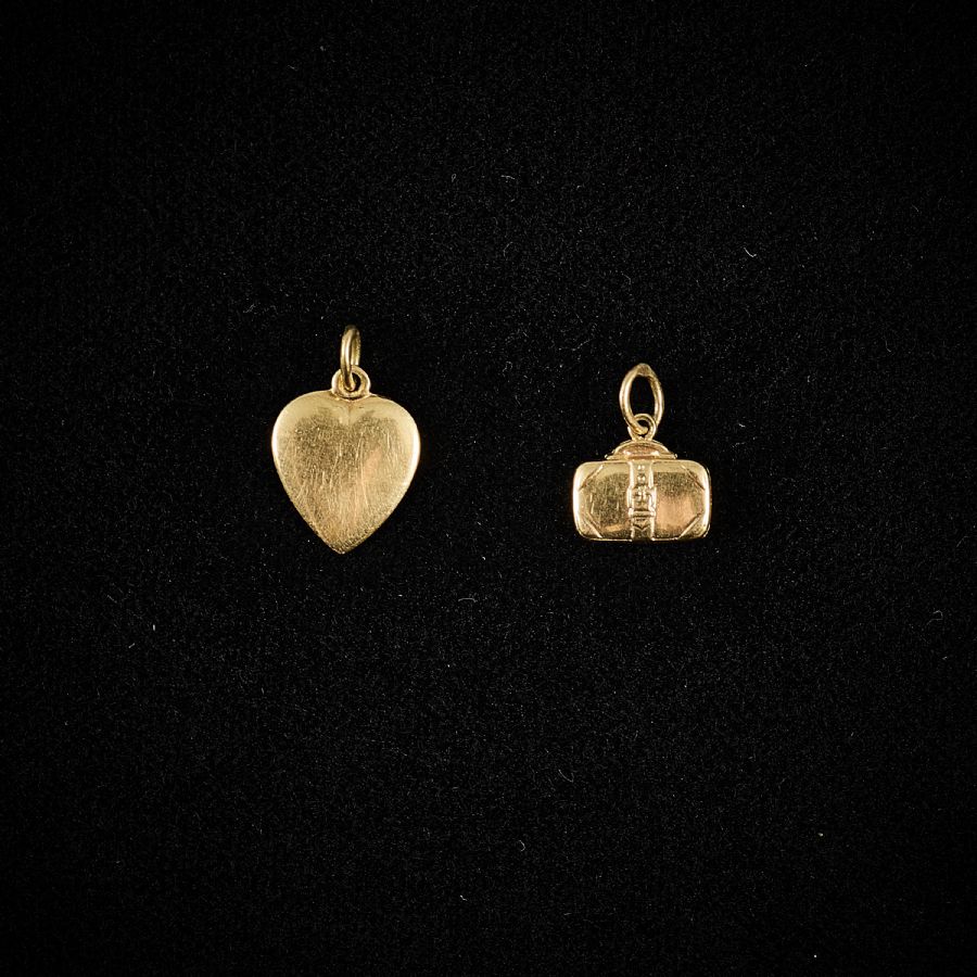 18k guld, 2 st föreställande ett hjärta och en väska. Längd: 1 cm ca. Vikt: 2,5 g