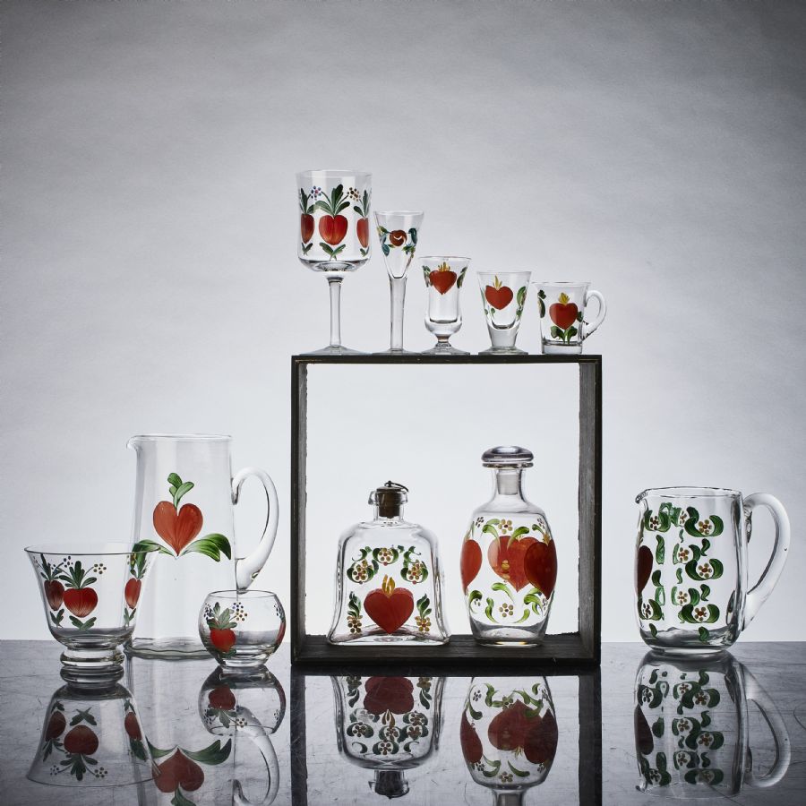 34 delar, Strömgården, "Allmoge", 6 vinglas, 4 karaffer, 4 snapsglas, 18 starkvinsglas, skål, ljuslykta, handmålat glas