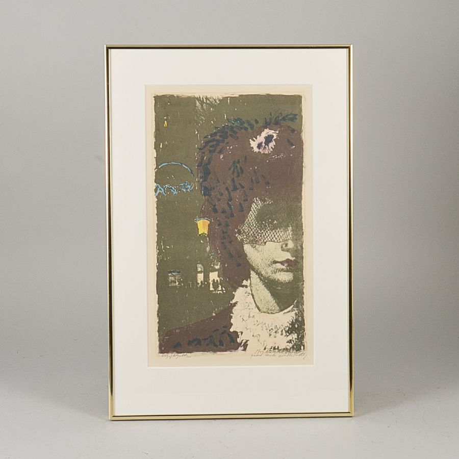 Stig Munthe Sandberg, Kvinna i flor. Signerad. Färglitografi, bildmått: 41x24 cm, yttermått inklusive ram: 59x39 cm