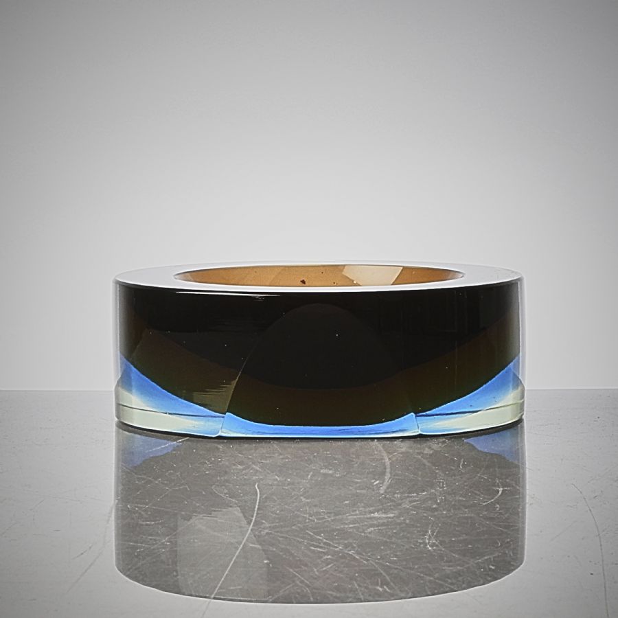 Murano, blå/grön glasmassa. Diameter: 20 cm. Height: 7 cm cm, label marked, några repor.
