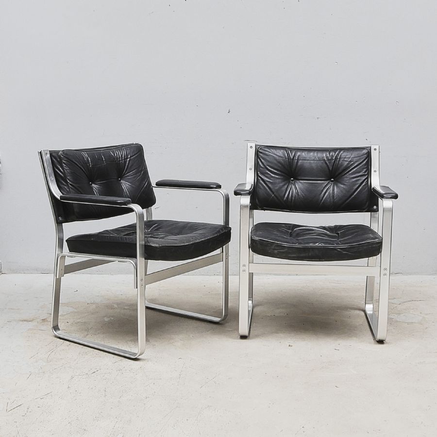 Karmstolar, ett par, "Mondo", JOC möbler, Vetlanda. Stomme av aluminium. Svart, skinnklädsel. Sitthöjd: ca 45 cm. Höjd: 80 cm