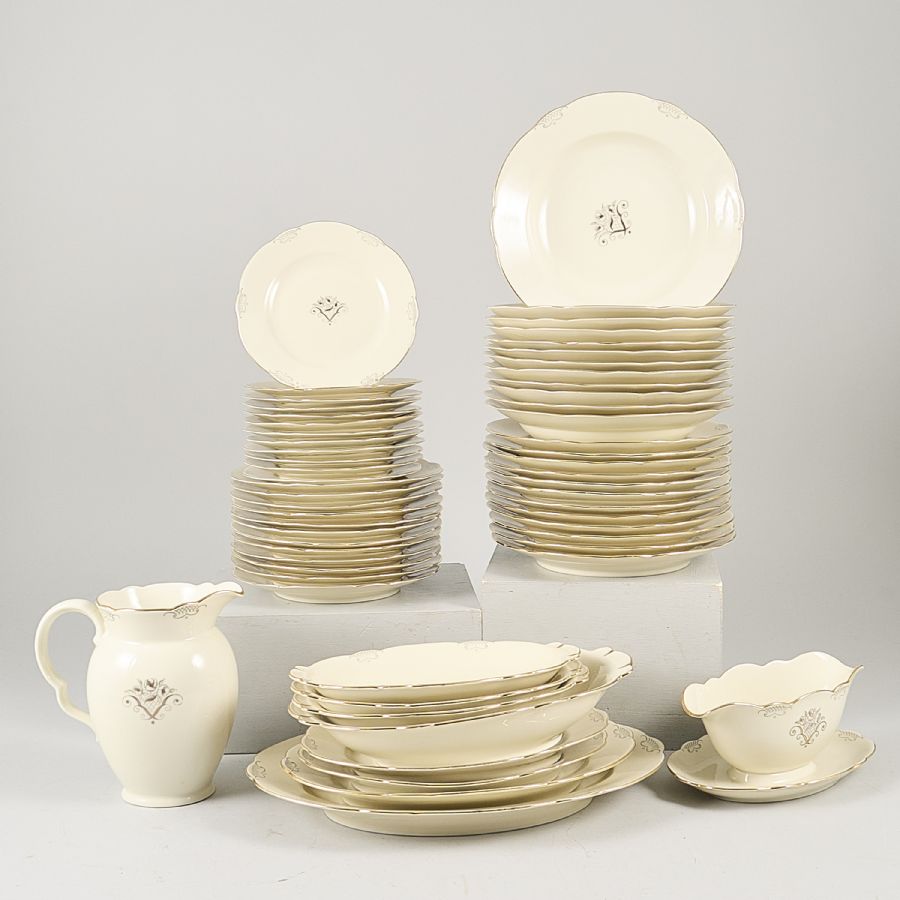 58 delar, Lidköping ALP, dekor med blomma och förgylld kantbård, 12 mattarllriakr, 12 djupa tallrikar, 12 assietter, 12 förrättstallrikar, 8 serveringsfa. Längd: 24-35 cm, såssnipa, tillbringare