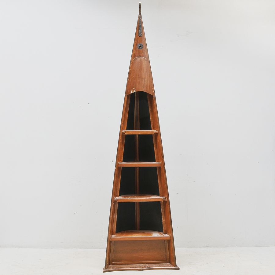 i form av en kanot, mäkrt Buttjer, 4 hyllor, mörkbetsad faner. Höjd: 230 ca, bredd 67, djup ca 36 cm