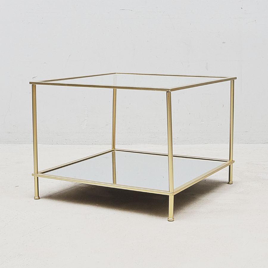 stomme i gulmetall, två bordsskivor, härdat glas + spegelglas, 60x60. Höjd: 46 cm