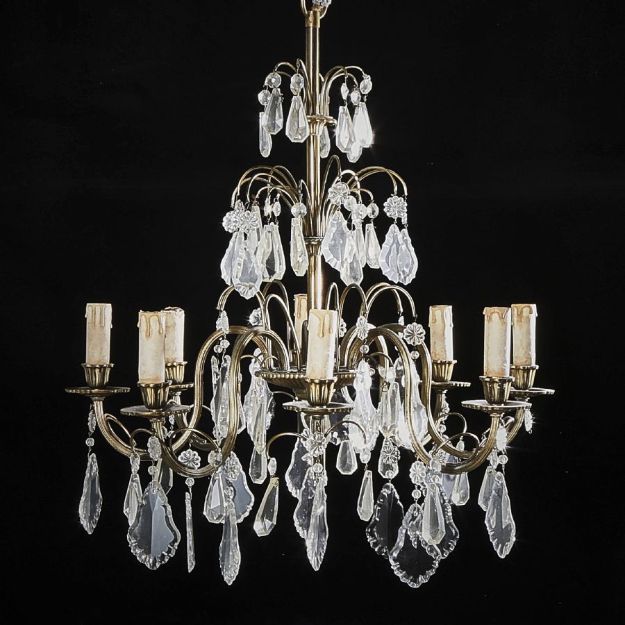 med prismor, stomme i mässing, åtta ljusarmar. Diameter: 56 cm, höjd: 55 cm